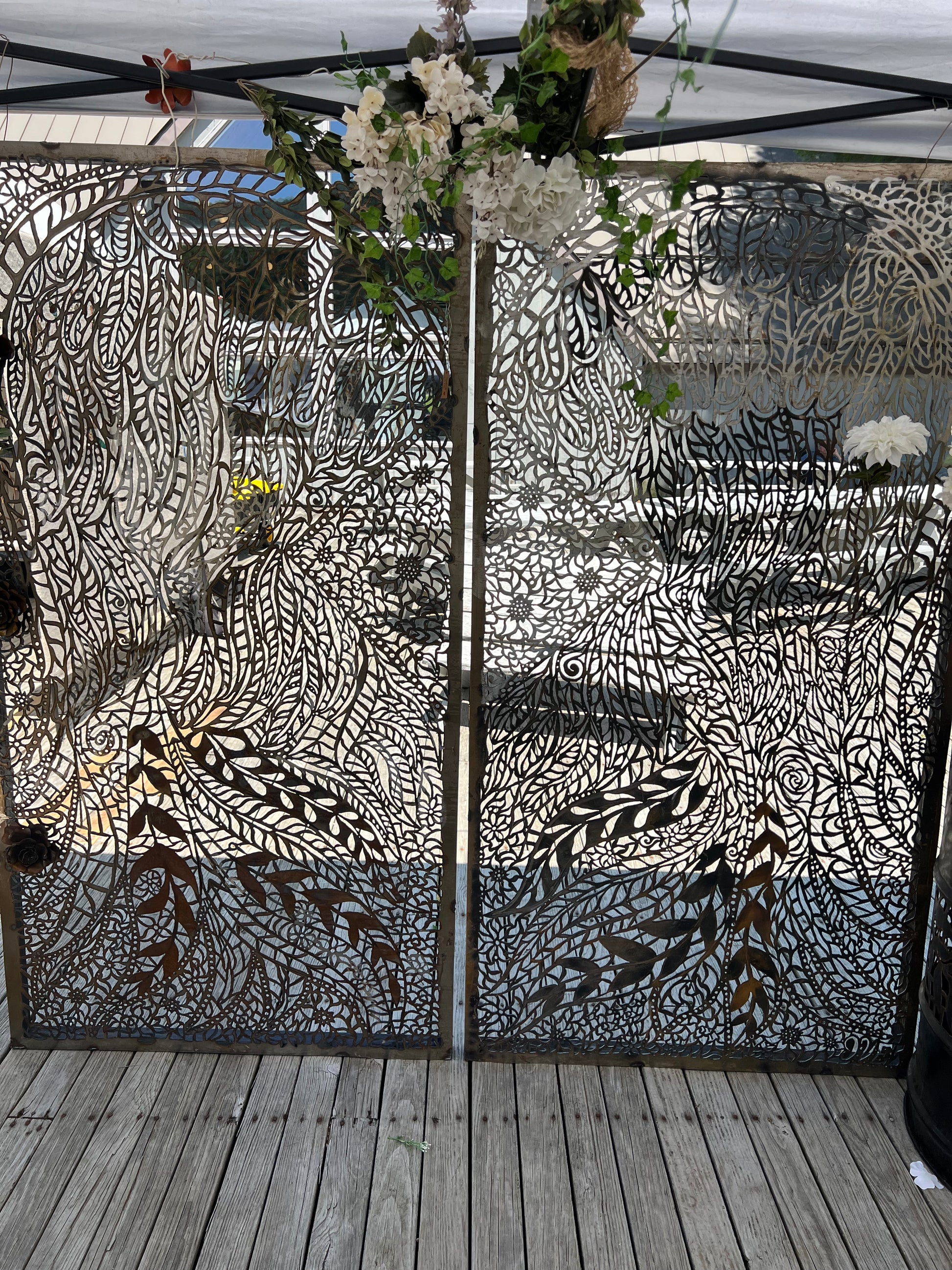 This is a concept in progress meant to depict abstract angel wings in gates custom made by me that would embody angel wings opening and closing upon function. This vision came to me and began on Easter Sunday of this year. Featured is one half of the gate in completion with second half in progress.